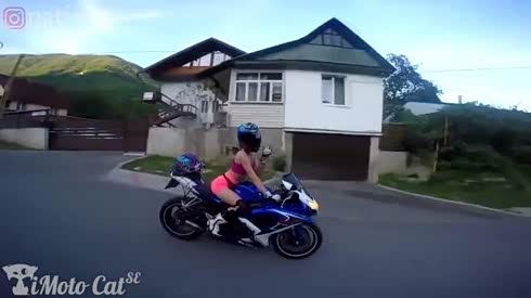 瞪大眼睛 这小妮子骑摩托车技术真不错