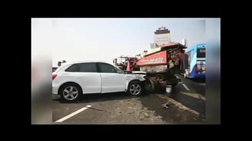 脑残女司机开车玩自拍,撞上收割机,车头面目全非。