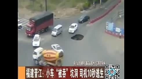 实拍 两米深坑吞噬轿车 司机10秒惊魂逃生!
