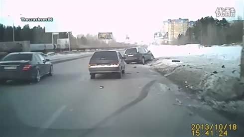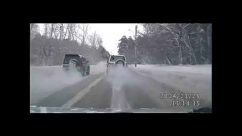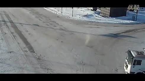 丰田霸道雪地失控 拦腰暴撞小轿车