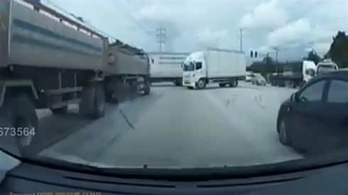 这技术牛掰了!大货车司机临危不乱 两货车夹缝中 避免了一场灾难