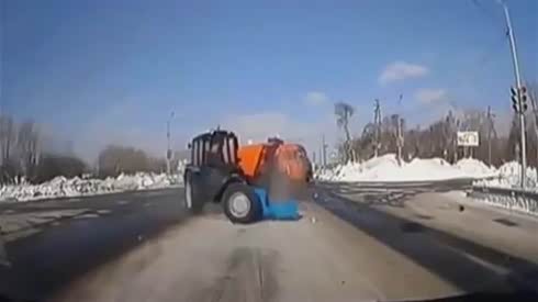 监控实拍:疯狂渣土车闯红灯 拖拉机被撞惨...