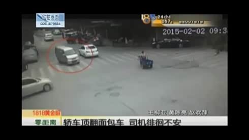 监控实拍:女司机撞翻面包车 三轮司机淡定前行躲过一劫
