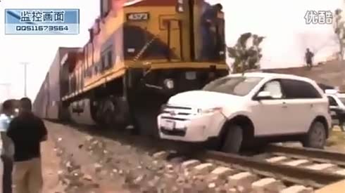 监控实拍:道口熄火 福特小车被火车撞飞数十米,,,