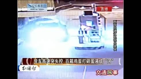 监控实拍:货车高速突失控 百箱鸡蛋打碎蛋流成“河”