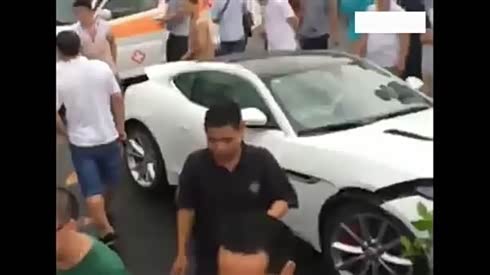 惨烈车祸 大客车追尾捷豹超跑翻车