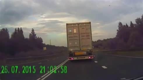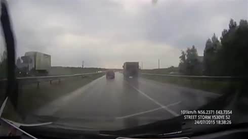监控实拍:卧槽!小车突然变线 致巨无霸大卡失控翻滚...