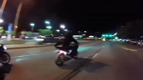 疯狂作死!机车男载妹子深夜街头玩倒挂