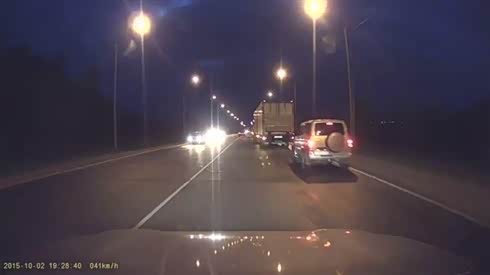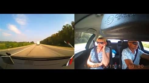 实拍小汽车高速超车遭对向车道货车撞成两截