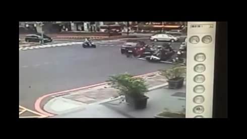 倒霉蛋女司机 闯灯连撞7辆摩托车