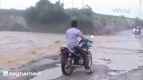 屌丝骑摩托挑战洪水路段 路人看傻了