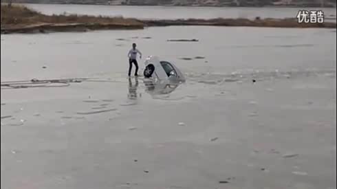 实拍:崩溃!小车漂移玩酷陷冰窟 悲催救援 车被拉散...