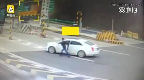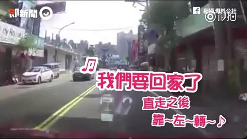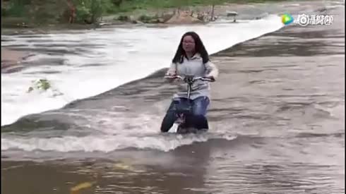 自己捂嘴乐 女子骑电动车横穿湍急河流
