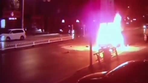 实拍:四百万兰博基尼刚买两月 当街自燃烧成废铁...