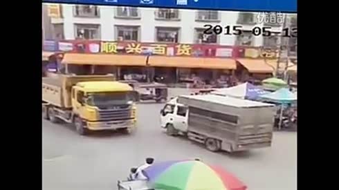 监控实拍:女子过马路玩手机 惨遭两大货车碾压...