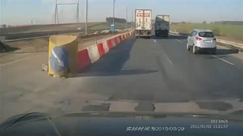 监控实拍:大货车撞飞隔离墩 后车倒霉...