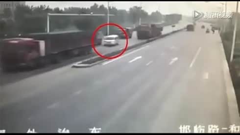 监控实拍 面包车瞬间被两辆大货车挤扁