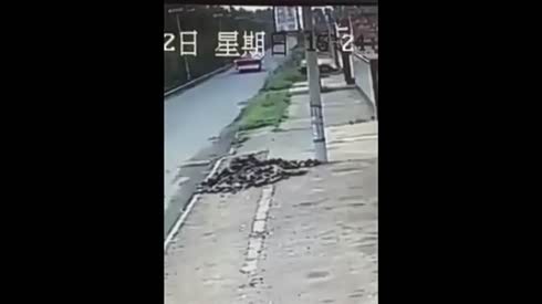 监控实拍:二货司机倒车 小车急躲闪 飞进施工洞...
