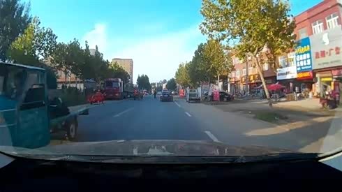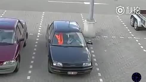 监控实拍宝马对撞 撞到路灯 差点砸到美女
