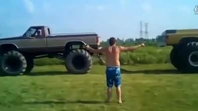 这回杯具了 实拍大脚皮卡车拔河出意外