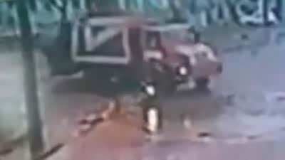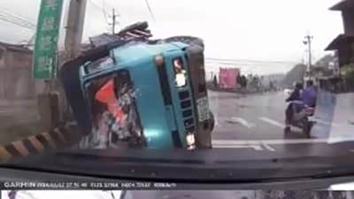 不幸中的万幸 大卡车转弯撞倒盲区车友