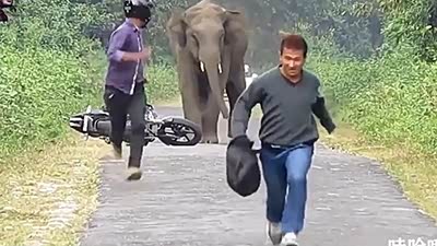 吓得不轻 大象堵路摩托车友疯狂逃命