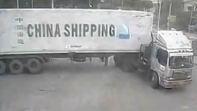 惊险一幕 盲区行人险遭集装箱车碾压