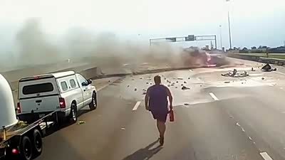 轿车撞半挂爆炸起火 众人冒险紧急施救