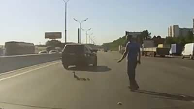 有爱一幕!俄罗斯车友护送小鸭过马路