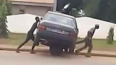 倔强的哥俩 牛人展示爆逗人力拖车法