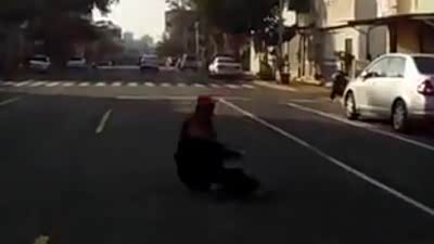 马路拼演技 碰瓷哥假摔倒地讹诈车友