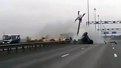 路灯杆悲剧了 失控拖挂货车横扫公路