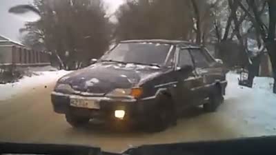 实在难以躲闪 轿车压雪失控突然来袭