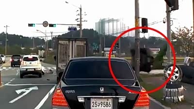 自食苦果!实拍SUV抢灯被撞当场翻车
