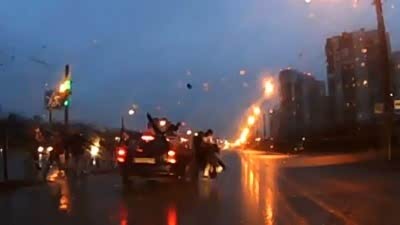 突遭横祸!SUV雨天闯红灯撞翻多名行人