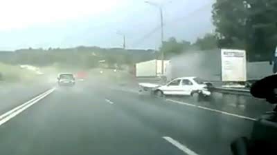 险些酿大祸 轿车雨天失控悲惨撞护栏