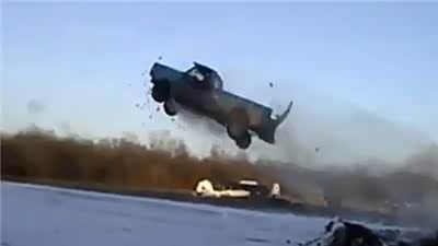 真敢玩啊!车友驾驶老皮卡上演疯狂跳跃