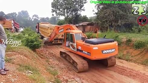 互帮互助 挖掘机帮助满载卡车上泥坡