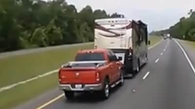 拖车前轮爆胎 连同皮卡一起冲进地沟