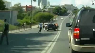 真是太囧了!没拉手刹溜车众人一路狂追
