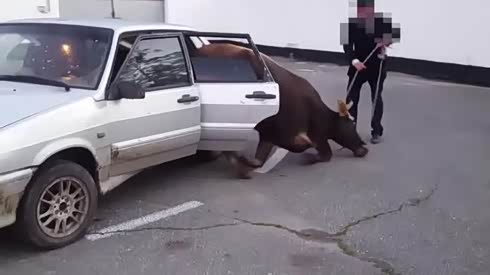 战斗民族真彪悍 轿车里居然拽出一头牛
