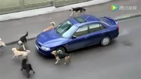 招谁惹谁了 倒霉轿车被一群狗狗围攻