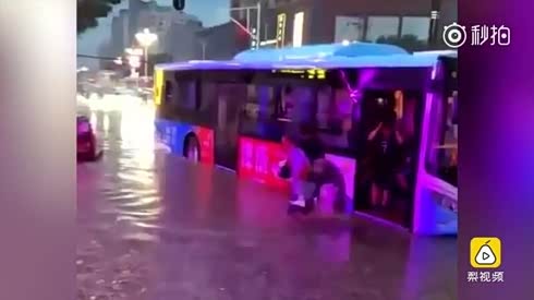 站台积水太深 他将乘客全部背下公交车