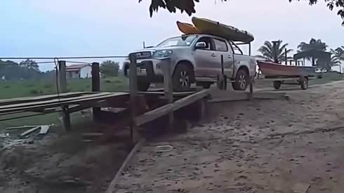 你敢这么玩吗? 皮卡拖拽小船过木桥