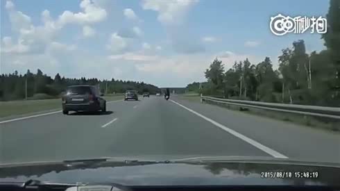 熊出没注意 人扮狗熊在高速路上骑摩托