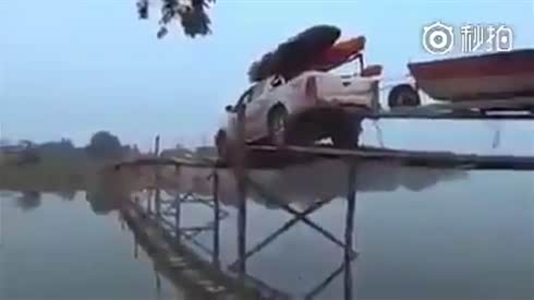 胆子真够大的 皮卡驶过单薄的小木桥