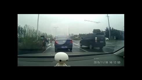 美女骑电车闯灯撞车 姿势奇葩笑死人
