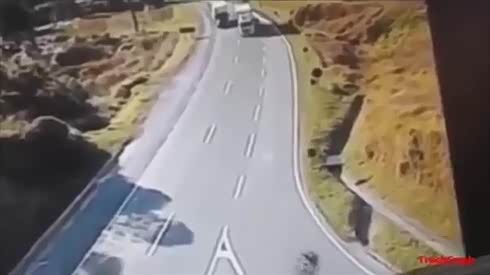 吓死你!摩托车漂移过弯 惨被大货车摧毁