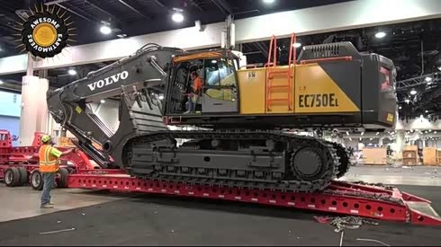 上车方式霸气 沃尔沃大型挖掘机上拖车