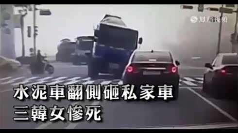 实拍水泥罐车侧翻压扁轿车 车内三女子惨死